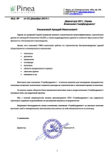Строительная компания ООО «НовоСтрой» выражает благодарность компании ООО «ГлавФундамент» за добросовестное и качественное сотрудничество и выполнение своих договоренностей. Мы очень ценим не только ценовую политику компании и качество продукции, но и наши теплые отношения с коллективом, которые сложились у нас на протяжении нашего сотрудничества.